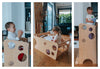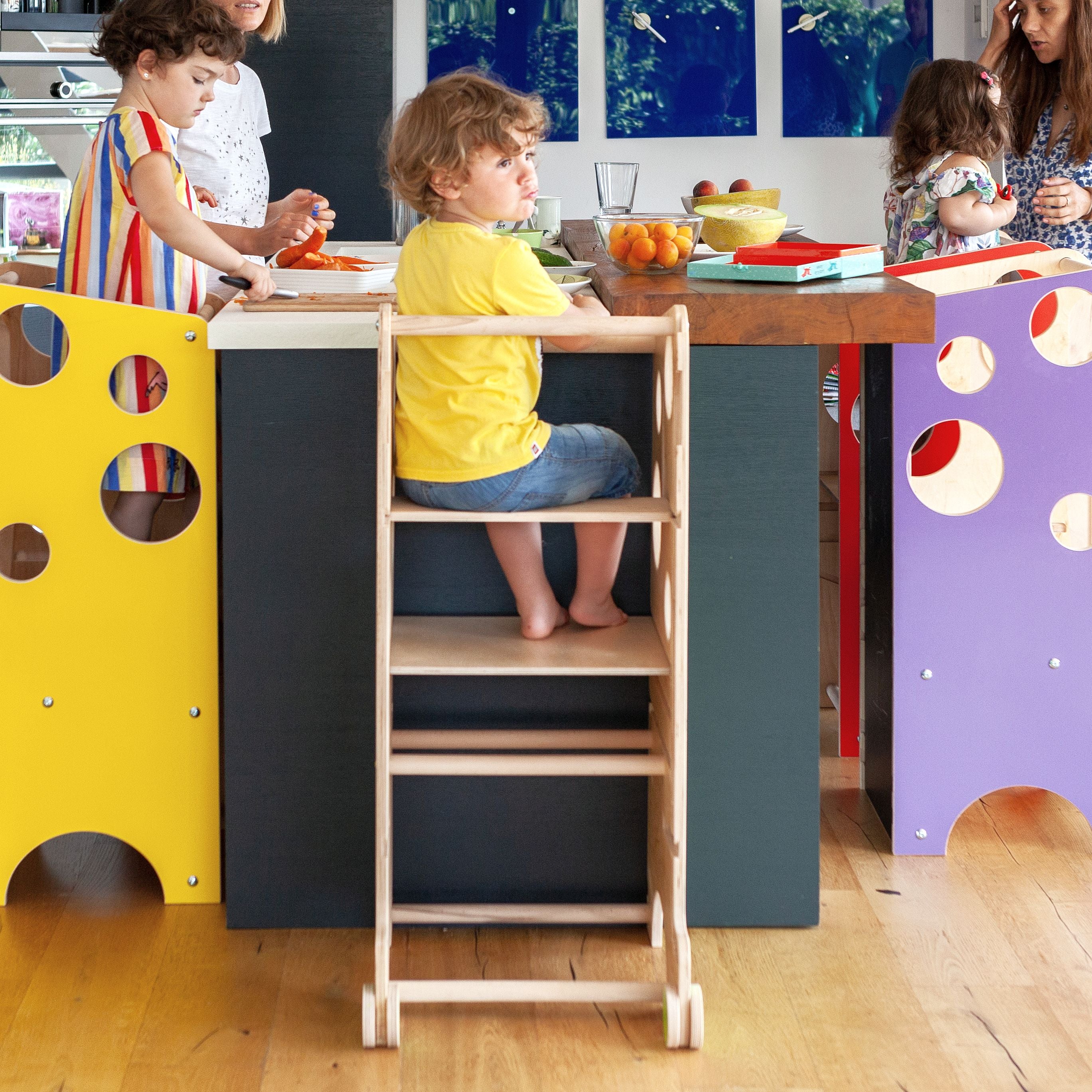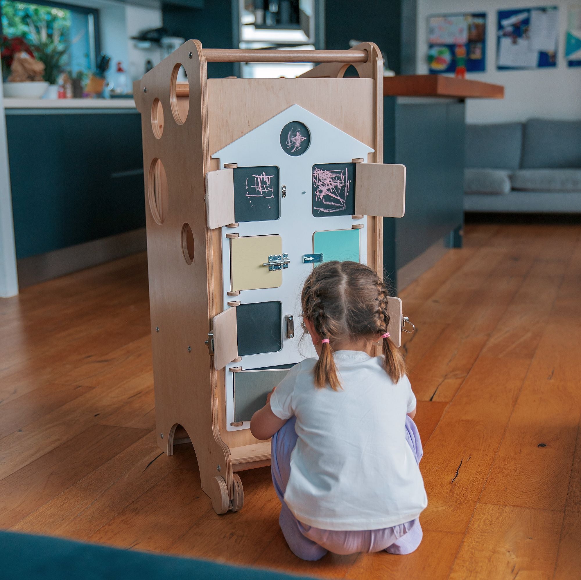 Der Turm lässt sich in nur wenigen Sekunden in einen Mini-Schreibtisch umwandeln. Er ist groß genug, um sogar zwei Kinder gleichzeitig Platz zu bieten, und die Tischplatte kann für zusätzlichen Komfort geneigt werden. Unter der Tischplatte kann eine Papierrolle angebracht werden – ideal zum Zeichnen oder für kreative Aktivitäten.