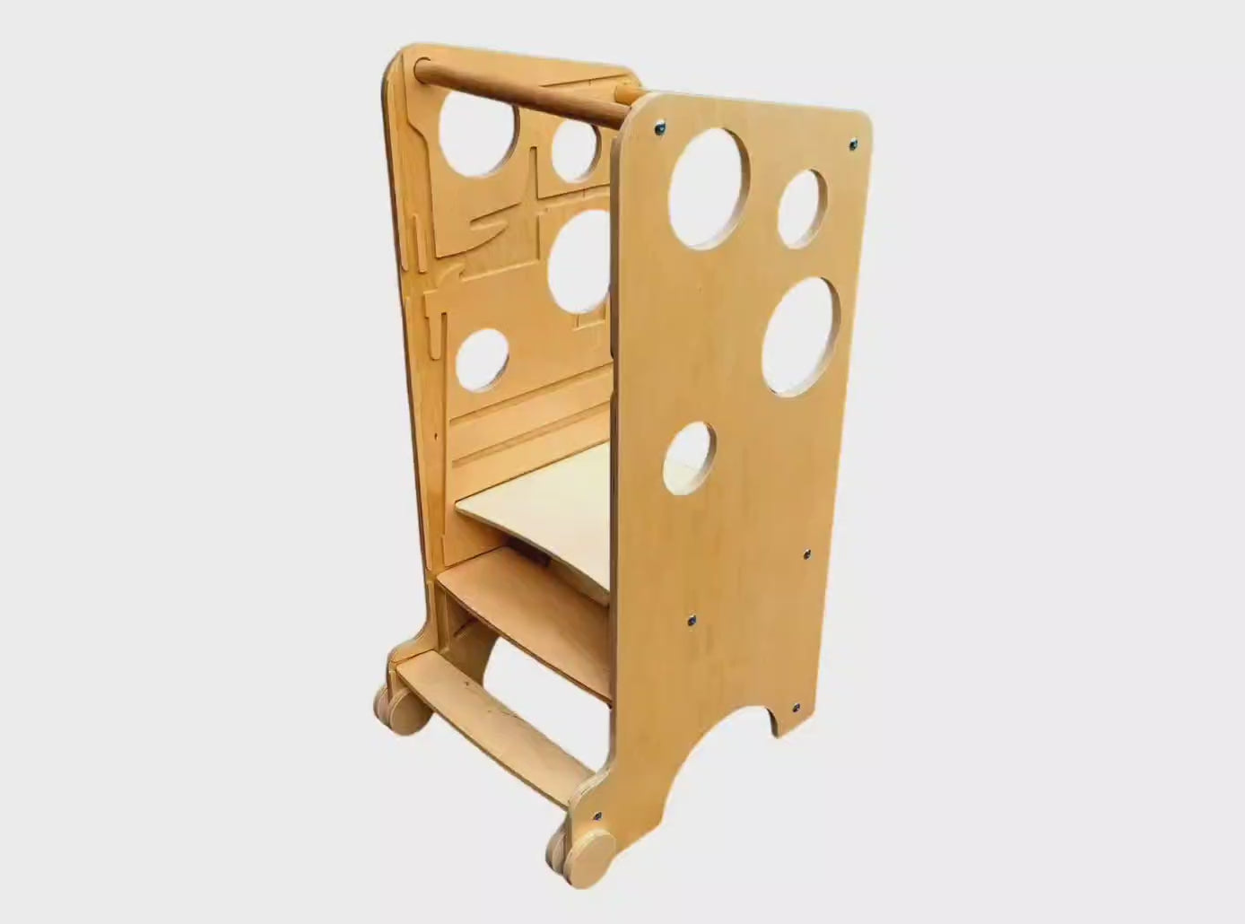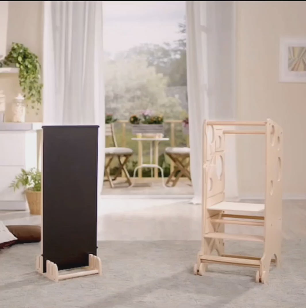 Durch Hinzufügen von Zubehör lässt sich unser Montessori-Turm auch als Babyhochstuhl, Schaukel, Shuffleboard und vieles mehr verwenden. Insgesamt bietet der Leea Lernturm dank Zubehör 18 Funktionen zum Spielen und Lernen!